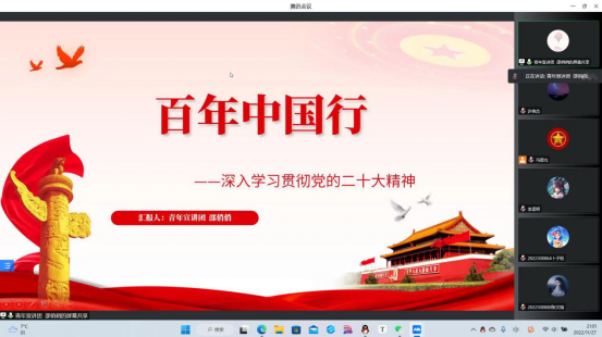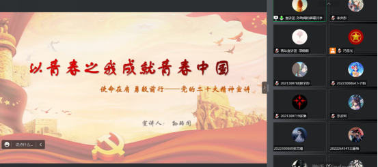各团支部作党的二十大精神宣讲。根据疫情防控有关要求,本次宣讲在线上举行。会议由学院团委组织委员冯恩光主持。宣讲团三位同学邵俏俏、孙珞闻、王雅楠依次进行宣讲。
