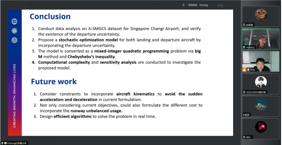 11月17日晚,来自新加坡科技研究所(A*STAR)的高级研究员(Senior Scientist)张逸成博士应我院副教授闫浩的邀请,为民航国际讲坛作题为“考虑起飞不确定性的机场滑行道联合调度问题研究”线上讲座,学院多名师生参加了此次讲座,讲座由闫浩主持。