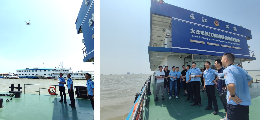 实地调研,掇菁撷华。活动中,全体成员在太仓港共同乘坐公安艇,开启了长江生态保护志愿巡航之旅。大家领略着长江之美,同时也关心着长江的生态文化,通过风力感知,水流测速和水质抽检,了解巡江工作的各项环节。随后,参观了太仓市长江禁捕联合执法基地,现场听取了“长江生态大保护”政策以及禁渔行动相关法规,切身感受到非法捕捞和违规排放给长江生态环境和水质安全带来巨大的隐患,深刻意识到保护长江渔业资源,共谋生态持续发展对维护国民经济稳定的重要性。同时,了解到近些年巡江工作中主要以机械化为主,疫情突袭,炎炎夏日,工作强度相对更高,亟需引入智能联动无人机群侦测技术实现精准定位、快速搜救和救援定投功能,提高巡江工作效率和水平。