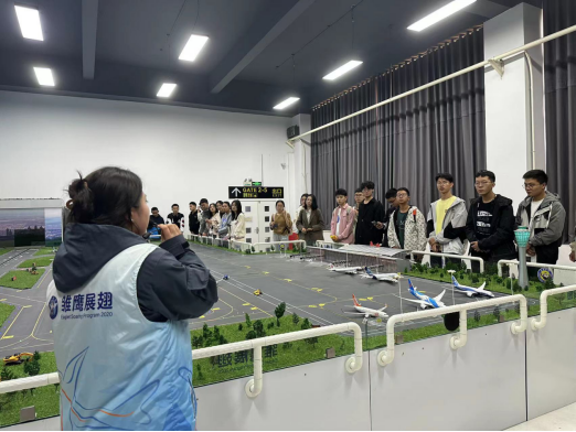 上午的研学以观察和讲解为主,下午的项目则侧重动手实操。在智能全动机场沙盘区,借助西安咸阳国际机场T3航站楼的微缩模型,志愿者演示了民航客机起降和调度过程,不仅让大家身临其境感受了机场运维的复杂性,也激发了同学们对智慧民航、机场智能运维等领域的兴趣。