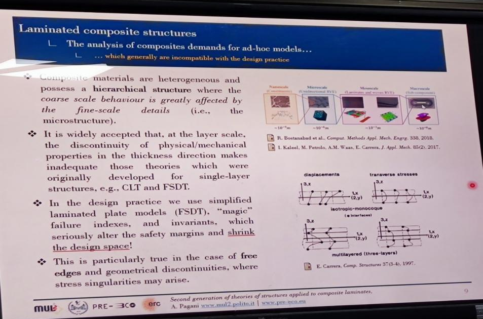 4月10日,Alfonso Pagani副教授为学院师生作了题为《Secondgeneration of theories of structures applied to compositelaminates》的专题报告。他结合对复合材料层合板结构等方面的研究,首先回顾了复合材料层合板的第一代结构理论,分析了其优势以及需要改进的不足之处。随后,介绍了正在探索的第二代结构理论,并提供了实现从微观到宏观尺度具有可扩展和高精度的高阶有限元的可能性。最后AlfonsoPagani副教授通过问答的形式,对层合板结构中的详细应力分析和失效行为、纤维增强复合材料的多尺度渐进失效、屈曲和后屈曲等方面,与线上师生做了沟通和交流。